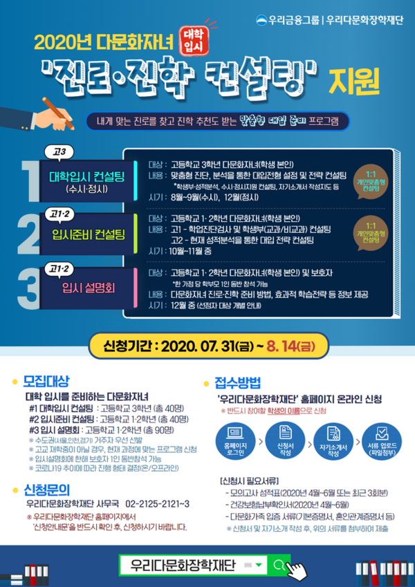 다문화자녀 진로·진학지원 프로그램은 대학 진학을 앞둔 다문화자녀에게 맞춤형 정보 및 1:1 개인 컨설팅을 지원하는 프로그램으로, 우리다문화장학재단에서 올해부터 새롭게 시작하는 사업이다. 외부 입시컨설팅 전문 업체와 협업해 체계적이고 전문적인 지원을 할 예정으로 우리다문화장학재단이 모든 비용을 부담한다.