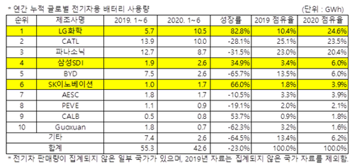 LG화학은 10.5GWh로 82.8% 급증하면서 전년 동기 4위에서 1위로 올라섰고, 삼성SDI는 34.9% 증가한 2.6GWh를 기록해 순위도 4위로 한 계단 상승했다. SK이노베이션은 66.0% 증가하면서 1.7GWh에 도달, 순위도 세 계단 올랐다.