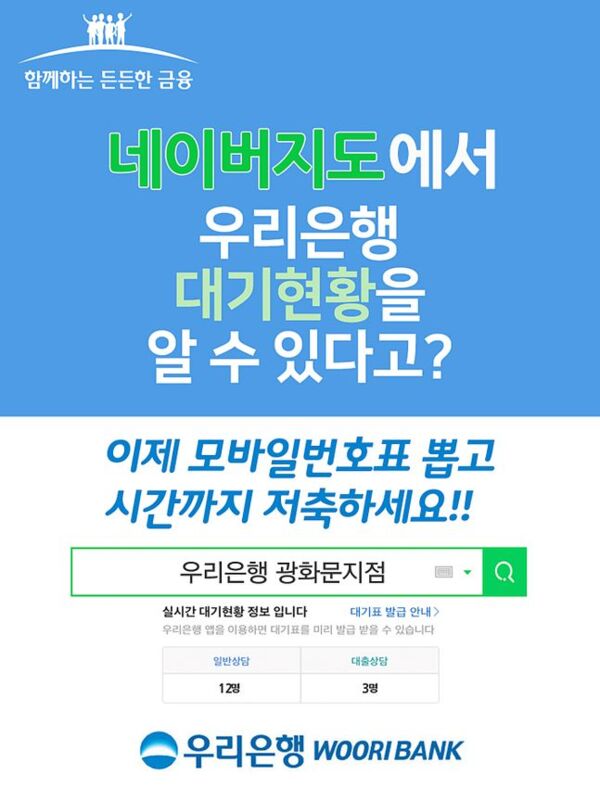 우리은행은 지난 7월30일 네이버와 제휴를 통해 네이버 지도에 우리은행 영업점 대기 고객 수 제공 및 모바일 번호표 서비스를 실시한다고 3일 밝혔다.