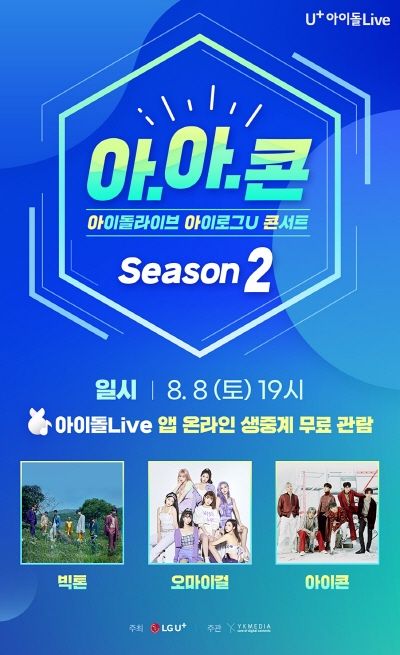 LG유플러스는 오는 8일 오후 7시 U+아이돌Live 리얼리티 오리지널 콘텐츠 아이로그U 시즌2 주인공인 빅톤, 오마이걸, 아이콘(iKON)의 합동 언택트 콘서트 '아이돌라이브 아이로그U 콘서트 시즌2(이하 아아콘2)'를 U+아이돌Live에서 독점 생중계한다고 5일 밝혔다.
