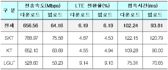 5G 평균 전송속도는 다운로드는 656.56Mbps(지난해 LTE 158.53Mbps), 업로드는 64.16Mbps(LTE 42.83Mbps)로 나타났다. 평가 단말은 삼성 갤럭시 S20+와 LG V50S 등 총 2종을 사용했다.