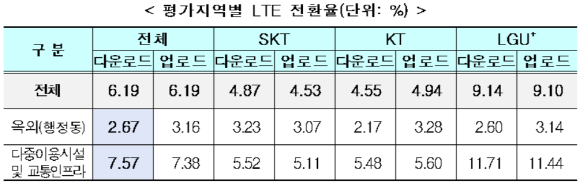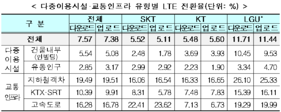옥외(행정동) LTE 전환율은 2.67%(KT 2.17%, LG유플러스 2.60%, SK텔레콤 3.23%), 다중이용시설·교통인프라 LTE 전환율은 7.57%(KT 5.48%, SK텔레콤 5.52%, LG유플러스 11.71%)로 다중이용시설·교통인프라의 LTE 전환이 더 많았다.