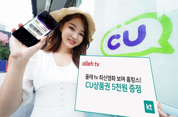 KT는 오는 13~19일 올레 tv 'CU 썸머 콜라보' 메뉴에서 최신영화를 구매한 뒤 리모컨으로 응모한 고객 선착순 1만명에게 CU편의점 모바일 상품권 5000원을 증정한다.