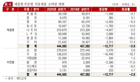 이 중 항공부문(항공유)은 국제선 운항 중단 등의 영향으로 지난해 같은 기간보다 45% 감소했다. 도로부문은 휘발유, 경유, LPG에서 각각 4%, 7.8%, 11.5% 하락에 그쳤다.