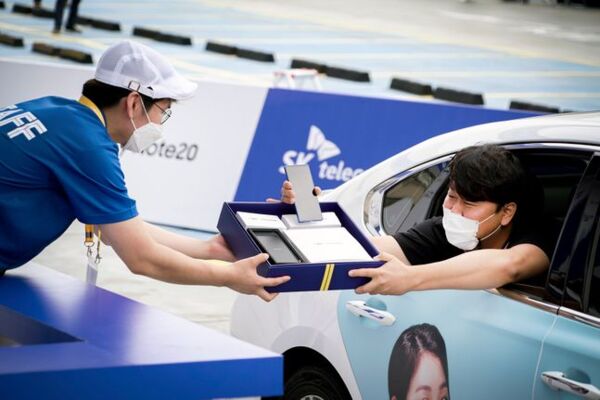 SK텔레콤은 이날 드라이브 스루 방식으로 갤럭시노트20 개통 행사를 진행해 주목을 받았다.