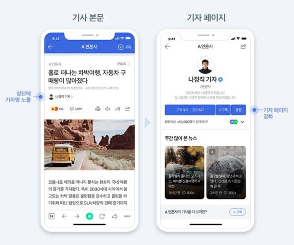 네이버는 뉴스 컨텐츠 제휴 매체 기자 개인의 브랜딩을 강화할 수 있도록 모바일 뉴스 본문 상단에 기자명을 강조해 노출하고 기자명을 클릭하면 뉴스 이용자와 적극적으로 소통할 수 있도록 '기자페이지' UI 개선을 적용했다고 14일 밝혔다.
