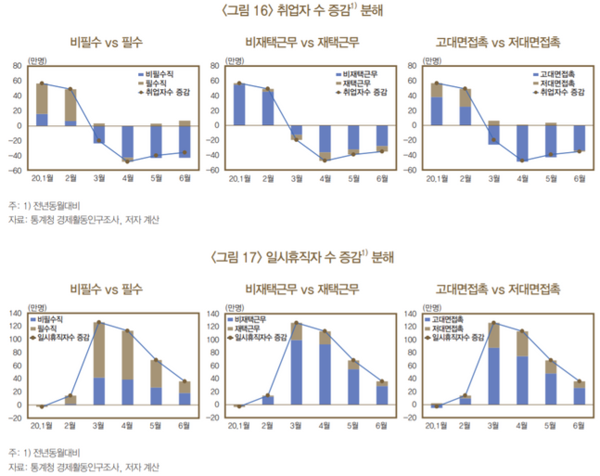 3~6월중 취업자 수 감소에 대한 비필수, 비재택근무, 고대면접촉 일자리의 기여율은 각각 106%, 77%, 107% 수준이다. 이는 비필수, 비재택근무, 고대면접촉 일자리가 전체 취업자에서 차지하는 비중(각각 42%, 74%, 55%)을 크게 상회했다.