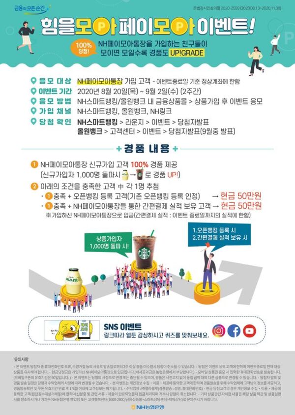 NH페이모아 통장을 가입하고 이벤트에 응모한 고객 전원에게 바나나우유 모바일쿠폰(기간 내 가입자가 1000명 돌파시 스타벅스 모바일쿠폰으로 업그레이드)을 제공하며, 오픈뱅킹 등록 고객과 간편결제 실적 보유 고객을 대상으로 각 1명을 추첨, 2명에게 현금 50만원을 제공한다.