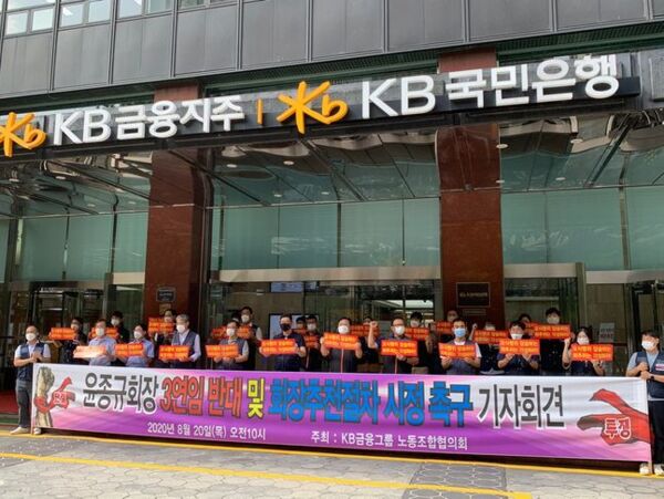 노조는 이 같은 주장에 KB금융 소속 직원 10명 중 8명이 윤 회장의 3연임에 반대하고 있다는 설문조사도 덧붙였다.