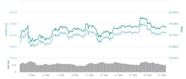 21일 코인마켓캡에 따르면 가상자산 대장주 비트코인은 지난 18일 심리적 저항선으로 여겨졌던 1만2000달러를 넘어섰다. 장중 약 1만2337달러(약 1463만원)에 거래되며 연고점을 경신하기도 했다. 이후 비트코인은 당일 1만1965달러까지 떨어지며 최근 1만2000달러선 부근을 횡보하고 있다.