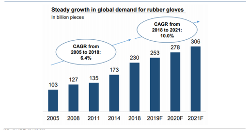 코로나19가 사용량 확대를 부추기면서 2005년부터 2018년까지 연평균 6.4%의 성장률을 보인 라텍스 장갑 수요는 2021년까지 연평균 10%의 성장이 예상된다.