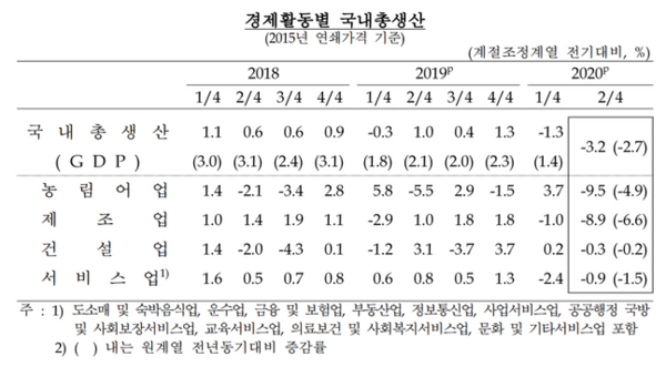 업종별로는 제조업 성장률이 -8.9%로 곤두박질쳤다. 속보치보다 0.1%포인트 올라갔지만 역대 최저치를 나타냈다. 도소매·숙박, 음식 등 서비스업은 1분기 -2.4%에서 2분기 -0.9%로 나아졌지만 마이너스 성장을 유지했다. 건설업은 같은 기간 0.2%에서 -0.3%로 내려갔다. 속보치보다 0.1%포인트 더 하향 조정됐다.