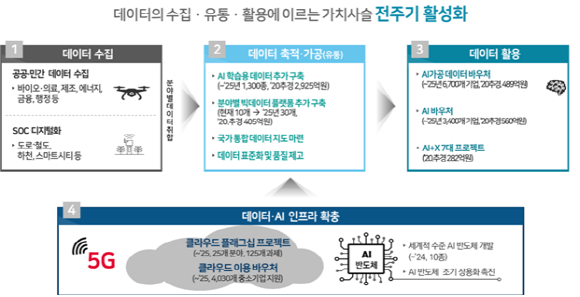 데이터 댐 7대 핵심사업은 △AI 학습용 데이터 구축 △AI 바우처와 △AI데이터 가공바우처 사업 △AI융합 프로젝트(AI+X) △클라우드 플래그십 프로젝트 △클라우드 이용바우처 사업 △빅데이터 플랫폼 및 센터 구축 등이다.