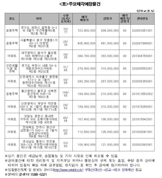 캠코(한국자산관리공사)는 오는 14일부터 16일까지 온비드를 통해 전국의 아파트, 주택 등 주거용 건물 146건을 포함한 1111억원 규모, 974건의 물건을 공매한다고 11일 밝혔다.
