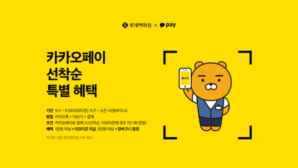 이를 기념해 사용자들을 위한 프로모션도 마련했다. 11일부터 29일까지 롯데백화점·아울렛 전국 오프라인 매장에서 카카오페이머니로 1만원 이상의 상품을 단일 결제하면 카카오톡 이모티콘을 증정한다. 이모티콘은 선착순으로 1인 1회 자동 지급된다.