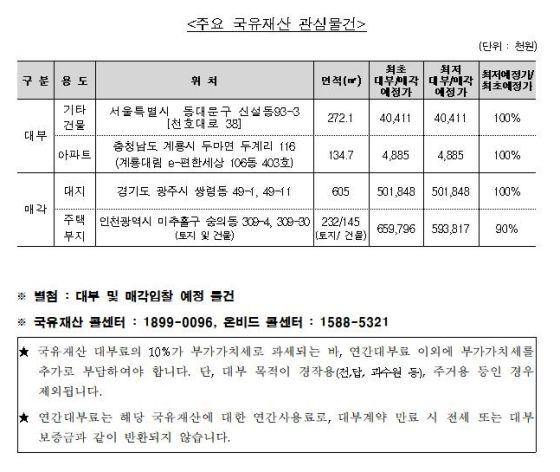 캠코는 활용도가 높은 국유부동산을 선별해 매주 온비드를 통해 대부 및 매각을 실시하고 있다. 국유부동산은 소유권이 국가에 있어 근저당, 임대차 등 권리관계가 복잡하지 않다는 장점이 있다.