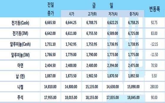 12일 비철금속업계에 따르면 지난 11일(현지시간) LME에서 거래된 전기동 가격은 톤당 6758달러로 전 거래일 대비 93달러 상승했다.