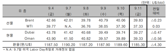 중동 두바이유(Dubai)는 전일 대비 배럴당 0.47달러 급락한 39.27달러로 집계됐다.