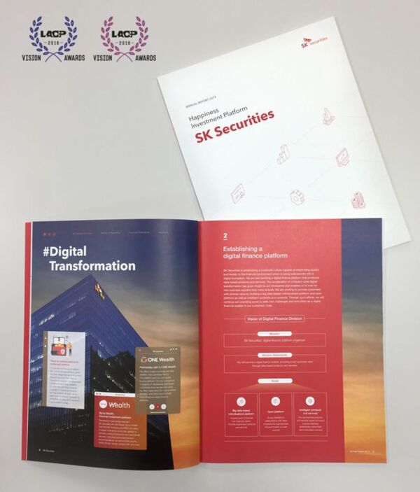 SK증권 2019 연차보고서는 새로운 비전과 사명으로 건강하고 혁신하는 회사를 만들어 고객·주주·구성원 등 사회의 행복과 성장에 기여하고자 하는 의지를 담았다. 또 커버 디자인, 이해관계자에게 전하는 메시지, 내용 구성, 재무 정보, 정보 전달력 5개 부문에서 만점을 받아 총 97점으로 은상을 수상했다.