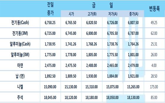 15일 비철금속업계에 따르면 지난 14일(현지시간) 런던금속거래소(LME)에서 거래된 전기동 가격은 톤당 6807달러로 전 거래일 대비 49달러 상승했다.