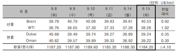 유럽거래소(ICE)의 브렌트유(Brent)는 전일 대비 배럴당 0.92달러 오른 40.53달러로 장을 마감했다.