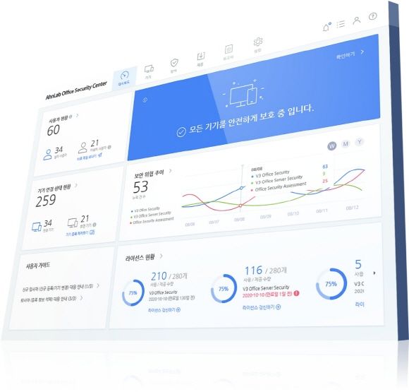 안랩은 오피스 시큐리티 제품군 구매 고객에 웹 기반으로 보안 상태를 통합 관리할 수 있는 '오피스 시큐리티 센터'를 함께 제공한다. 기업 보안 담당자는 언제 어디서든 PC·모바일 기기 등으로 오피스 시큐리티 센터에 접속해 전사 실시간 보안 모니터링, 원격 검사 및 업데이트, 보안 정책 적용 등을 실행할 수 있다.