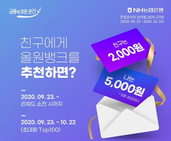 친구초대 서비스 출시를 기념해 9월 23일부터 리워드 소진시까지 '친구에게 올원뱅크를 추천하면? 이벤트'도 진행한다.