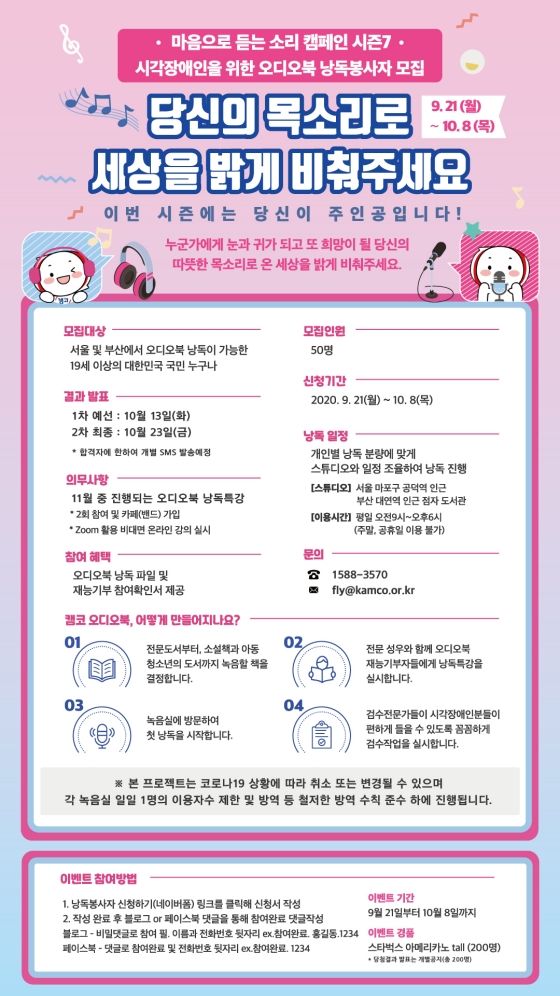캠코(한국자산관리공사)는 오는 10월 8일까지 캠코 홈페이지에서 시각장애인을 위한 오디오북(Audio Book) '마음으로 듣는 소리' 시즌7 목소리 재능기부자를 모집한다고 21일 밝혔다.