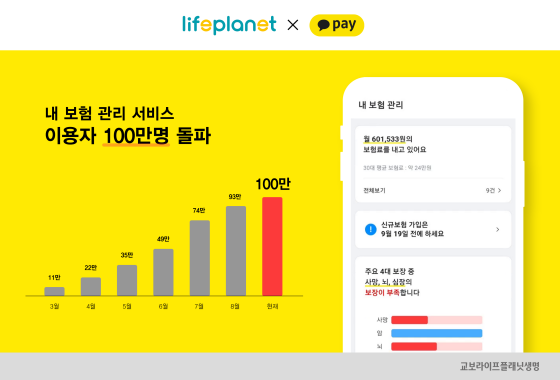 국내 최초 인터넷 전업 생명보험사 교보라이프플래닛생명보험(이하 교보라이프플래닛)은 지난 3월 국내 최대 생활 금융 플랫폼인 카카오페이와 함께 오픈한 '내 보험 관리' 서비스 누적 이용자 수가 100만명을 돌파했다고 21일 밝혔다.