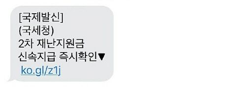 정부가 소상공인 등 코로나 2차 재난지원금 대상자에게 문자메시지 안내를 보낼 것을 예고한 가운데 2차 재난지원금 지급으로 위장한 스미싱 문자메시지가 발견됐다.
