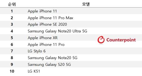 미국 스마트폰 시장 베스트 셀링 상위 3개는 애플 아이폰이 차지했다. 아이폰11은 출시 이후 줄곧 판매 1위를 지키고 있다. 지난 4월 출시된 SE 2020도 3위를 기록했다. 조만간 출시 예정인 아이폰12 대기 수요에도 불구하고, 통신사 등 주요 판매채널의 재고 조정을 위한 프로모션이 지속되면서 견조한 판매가 유지되고 있다.