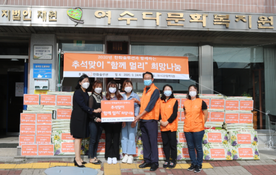 한화솔루션 여수공장은 24일 여수다문화복지원에서 스팸클래식세트와 재래김세트를 120가정에 전달하는 '2020년 한화솔루션과 함께하는 추석맞이 '함께 멀리' 희망 나눔' 행사를 진행했다고 밝혔다.