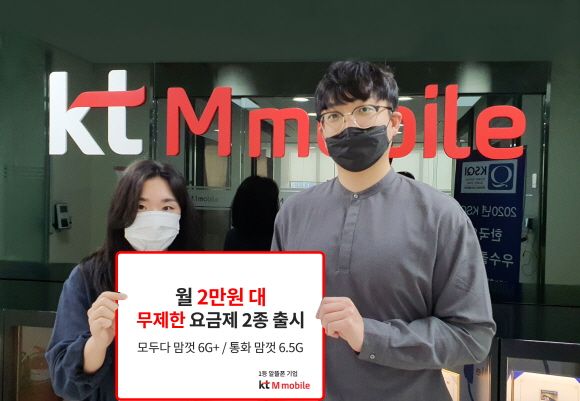 KT엠모바일은 월 2만원 대에 음성·문자·데이터를 무제한으로 쓸 수 있는 '모두다 맘껏 6G+'와 데이터 6.5GB에 음성·문자를 기본으로 제공하는 '통화 맘껏 6.5G' 요금제 2종을 출시했다고 25일 밝혔다.