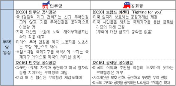 미 민주당과 공화당의 국제무역에 대한 입장은 모두 ‘자국 이익 우선’ 기조로 동일하다. 무역협정의 외연 확대 보다는 미국의 경쟁력과 이익 제고를 최고 가치로 삼아 지적재산권 보호 강화, 해외부패방지법, 공정무역을 추진할 방침이다.