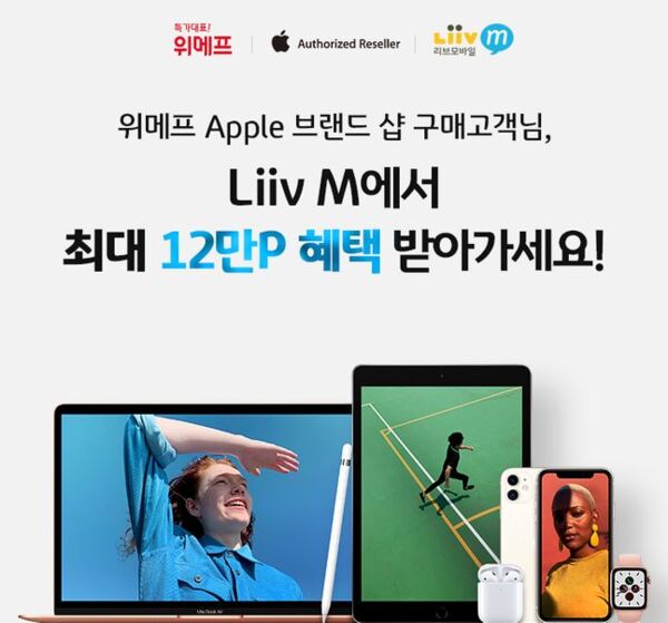 KB국민은행 리브엠은 '위메프 Apple 브랜드 샵'과 제휴 이벤트를 10월1일부터 10월말까지 실시한다고 밝혔다.