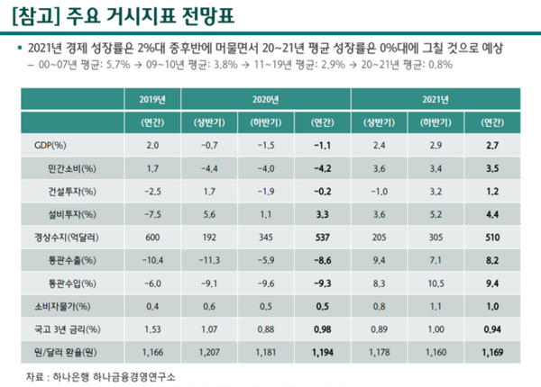 2020년 성장률이 –1%대라는 점을 감안할 때 2020~2021년 평균 성장률은 0%대를 나타낼 것으로 전망했다. 정유탁 하나금융경영연구소 연구위원은 "소득여건 악화와 취약계층 피해 확산 등으로 소비 회복이 제한적인 가운데 해외수요의 부진한 회복에 따라 수출 개선도 미진할 것"으로 진단했다.