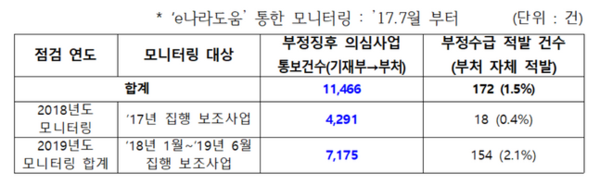 그러나 기재부의 이 같은 많은 양의 통보에도 불구하고 실제로 이를 전달받은 부처는 1.5% 수준에 해당하는 172건만을 자체 적발하는 수준에 그친 것으로 드러났다.