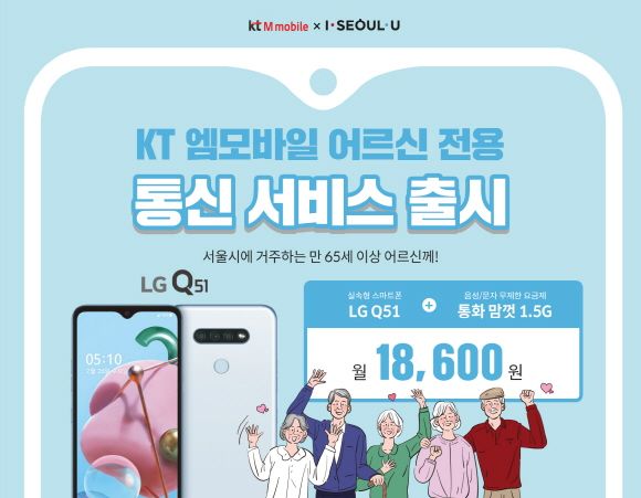 KT엠모바일은 오는 12월 31일까지 서울시에 거주하는 만 65세 이상을 대상으로 LG전자 실속형 스마트폰 LG Q51 공시지원금 10만원과 음성 무제한 요금제 '통화 맘껏 1.5G(월 LTE 데이터 1.5GB)'를 월 8900원에 제공한다.