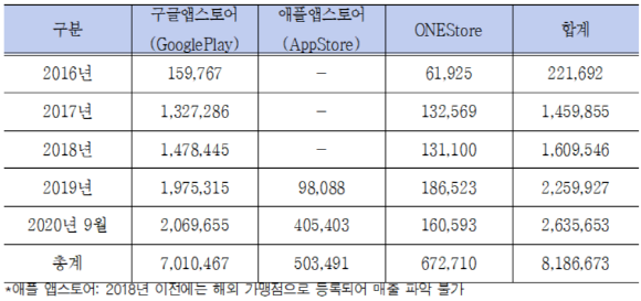 구글 플레이의 최근 5년간 매출 성장세는 폭발적이다. 2016년 1598억원에서 지난해 1조9753억원으로 12.4배 증가했다. 특히 올해는 코로나19 영향으로 1월~9월에만 2조원이 넘는 매출을 올려 이미 전년도 매출을 943억원 넘어서 사상 최대 실적을 기록했다.