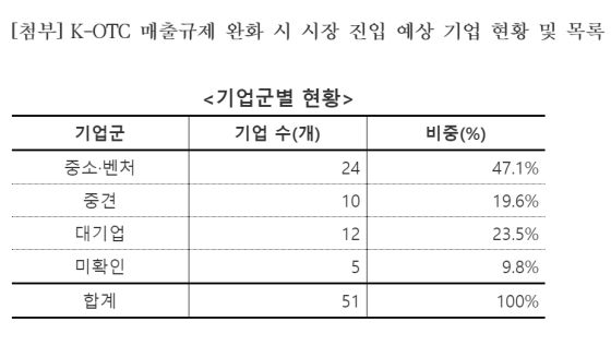 홍성국 의원이 금융투자협회로부터 제출받은 자료에 따르면 K-OTC 시장의 매출규제를 완화할 경우 시장 진입이 예상되는 기업은 51개사인 것으로 나타났다. 2020년 9월말 현재 K-OTC 시장에서 거래 중인 기업 수(134개사)의 38%에 이른다.