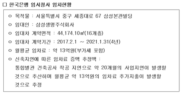 한은은 2017년 2월부터 중구에 소재한 '삼성본관빌딩'을 임차해서 임시청사로 사용하고 있는데 월평균 임차료는 약 13억원에 이른다. 공기 연장으로 늘어난 20개월치 임차료는 260억원으로 이미 계약된 4년간 지불액 624억원과 합하면 약 884억원에 이른다.