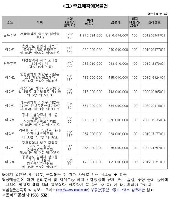 캠코(한국자산관리공사)는 오는 19일부터 21일까지 온비드를 통해 전국의 아파트, 주택 등 주거용 건물 220건을 포함한 2350억원 규모, 1504건의 물건을 공매한다고 16일 밝혔다.