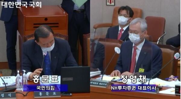 홍문표 국민의힘 의원이 '옵티머스 사태'와 관련해 NH투자증권의 옵티머스크리에이터 펀드 가입 권유 여부를 물었다.