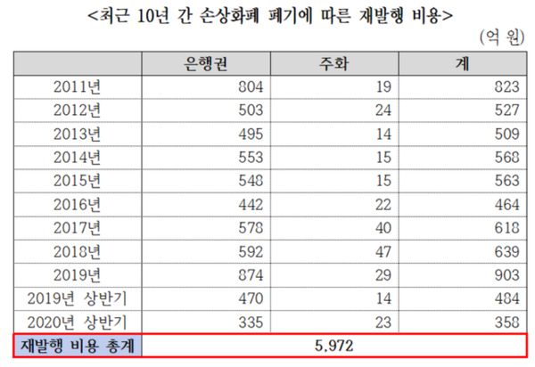 화폐 폐기 규모가 늘어나면서 이에 따른 대체 발행 비용도 꾸준히 증가하는 추세다. 지난해 화폐 폐기에 따른 재발행 비용은 903억원으로 2018년 639억원, 2017년 618억원과 비교해 대폭 늘어난 것으로 나타났다.