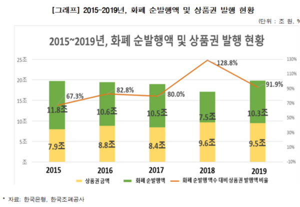 연도별로 조폐공사가 제조한 상품권 발행량과 총금액을 살펴보면 2015년 2억2951만장, 7조 9462억원에서 2019년 3억3583만장, 9조4668억원으로 대폭 증가했다.