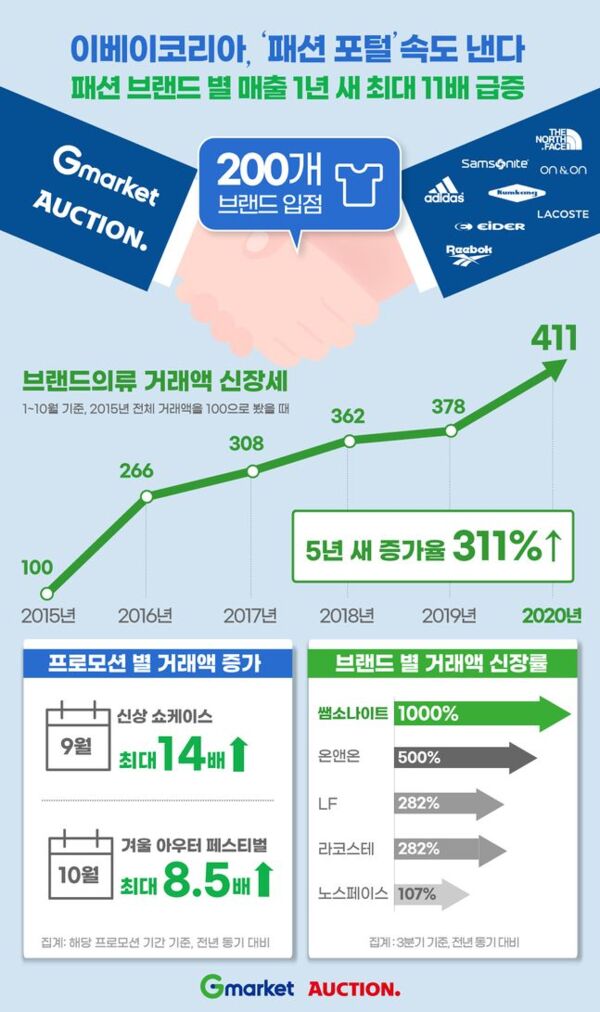 18일 이베이코리아가 운영하는 G마켓과 옥션이 직입점한 200개의 프리미엄 패션 브랜드를 대상으로 올해 3분기 판매 실적을 집계한 결과, 지난해 동기 대비 브랜드 별 거래액이 최대 11배(1000%)가 증가한 것으로 나타났다. 올해 새롭게 전략적 제휴를 맺은 패션 브랜드 수만 125개로, 1년 새 46%가 늘었다.
