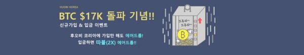 후오비 코리아가 ‘비트코인 1만 7000달러 돌파 기념 이벤트’를 진행한다고 25일 밝혔다. 지난 ‘비트코인1만 5000달러 돌파 기념 이벤트’에 대한 고객 성원에 힘입어 마련한 이벤트다. 가입만 해도 에어드롭을 지급하며, 입금 시 2배의 혜택이 돌아간다.