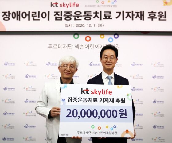 KT스카이라이프는 지난 1일 마포구 상암동 푸르메어린이재활병원에서 기부전달식을 갖고 푸르메재단 넥슨어린이재활병원에 2000만원 상당의 장애어린이 집중운동치료 기자재인 테라슈트 세트를 후원한다고 2일 밝혔다.
