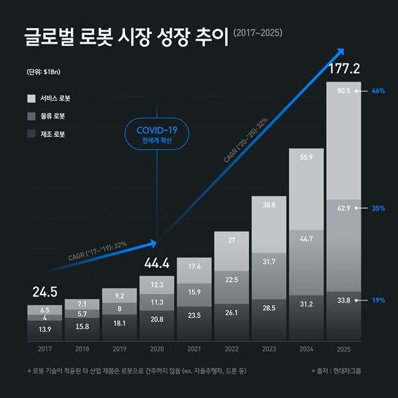 현대차그룹에 따르면 2017년 245억달러 수준의 세계 로봇 시장은 연평균 성장률(CAGR) 22%를 기록, 올해 444억 달러 수준으로 커질 전망이다. 코로나19 팬데믹에 의한 경제ㆍ사회적 패러다임 전환으로 올해부터 오는 2025년까지는 32%의 높은 연평균 성장률을 기록해 1772억 달러 규모로 시장이 성장할 것으로 예측된다.