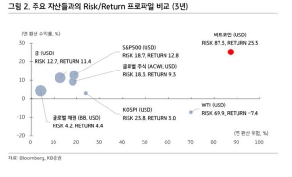 공원배 KB증권 연구원은 "비트코인이라는 이색 자산을 편입했을 경우 장단기 모두 높은 포트폴리오 효과가 나타났다"며 "비트코인을 10% 편입한 포트폴리오의 경우 변동성 확대보다 포트폴리오 수익률이 크게 확대되면서 포트폴리오 효율성 지표들이 유의미하게 개선됐다"고 분석했다.